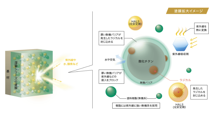 厚い無機バリア層で酸化チタン(顔料)の表面をコートして 紫外線の侵入を防ぐ。