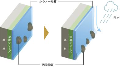 親水性に優れた塗膜表面と汚染物質の間に雨水が入り込み、